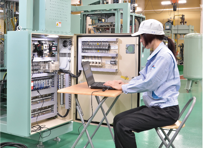 自社で設計/製作された機械が、お客様の要望通りの動作を果たすために重要なファクターと言えるのが、電気設計です。機械設計とは別のセクションで、専門の電気設計スタッフが担当しています。